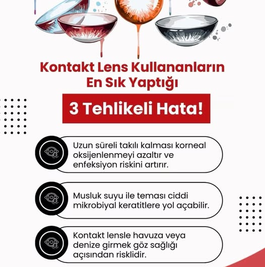 Açıklamada ayrıca, kontakt lenslerin musluk suyu ile temas etmesinin, ciddi mikrobiyal keratit gibi enfeksiyonlara neden olabileceğine dikkat çekildi. Bir diğer önemli uyarı ise, kontakt lensle havuza ya da denize girmenin göz sağlığı açısından büyük risk taşıdığı yönünde oldu.