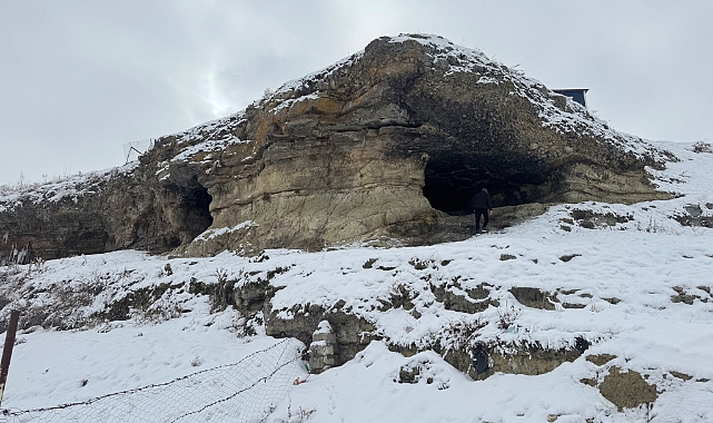 Ağrı’da bir çift gözü andıran mağara, kar yağışıyla birlikte eşsiz bir güzelliğe büründü.
