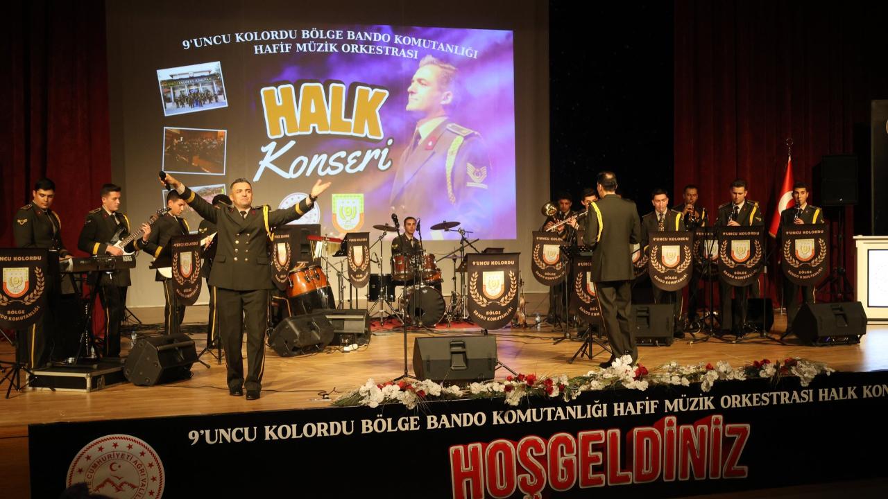 Ağrı Valiliği koordinesinde düzenlenen 9’uncu Kolordu Bölge Bando Komutanlığı Hafif Müzik Orkestrası Halk Konseri, vatandaşların yoğun ilgisiyle gerçekleştirildi.