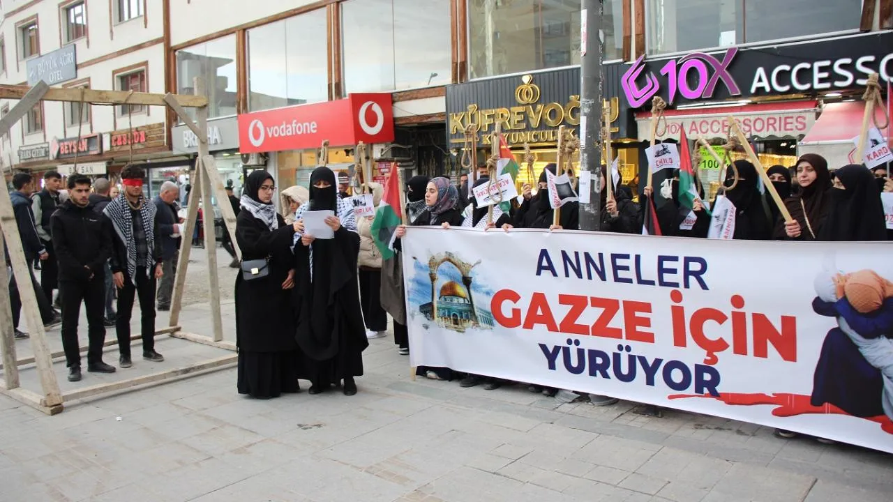 Ağrı’da HÜDA PAR Kadın Kolları Başkanlığı tarafından, Filistinli esirlere yönelik gündeme getirilen idam kararlarına tepki göstermek amacıyla basın açıklaması düzenlendi. Cumhuriyet Caddesi’nde gerçekleştirilen eylemde kurulan sembolik darağacı, protestonun en dikkat çeken unsuru oldu.