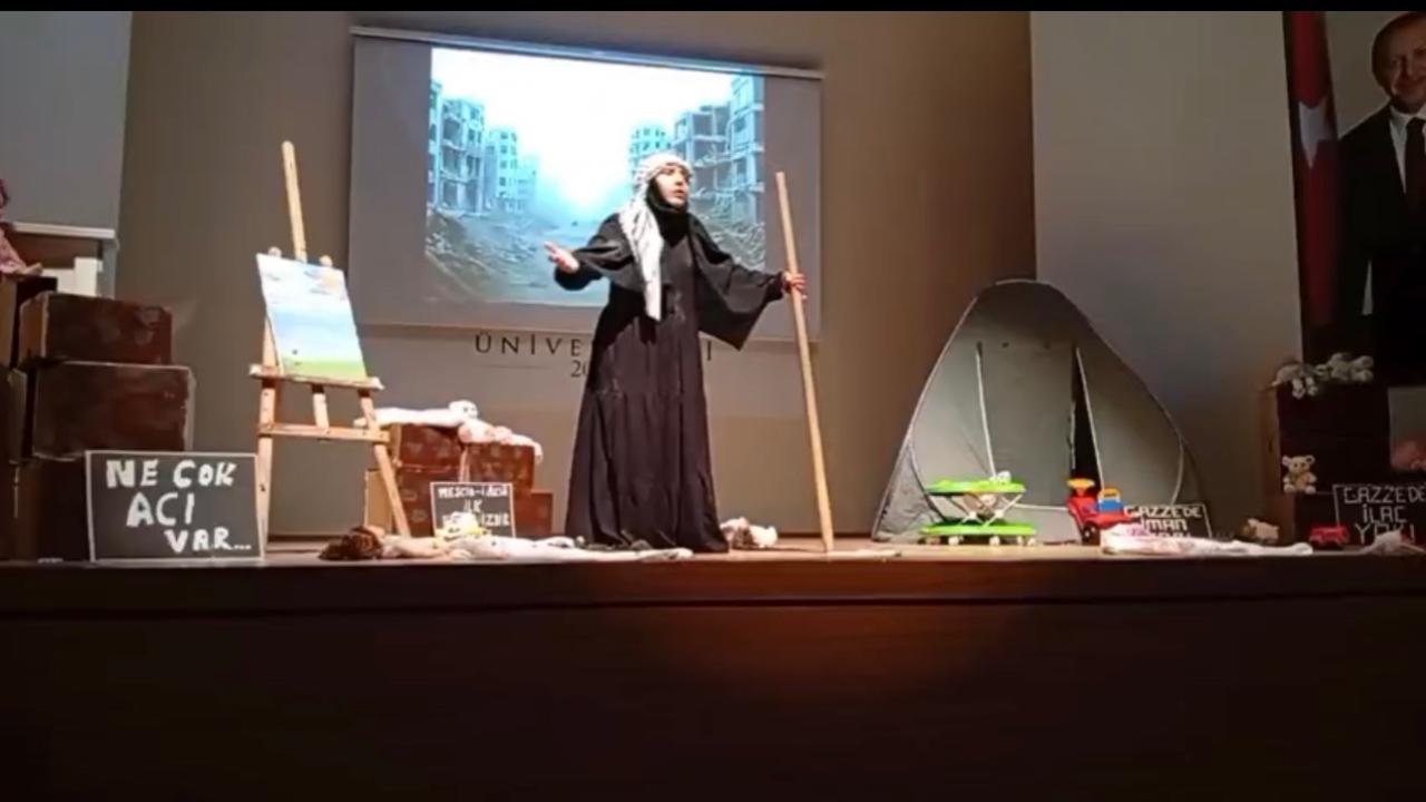 AİÇÜ Recep Tayyip Erdoğan Kültür Merkezi’nde gerçekleştirilen tiyatro oyununun metin yazarlığını ve yönetmenliğini Sinem Şenel üstlendi. Duygu dolu anlara sahne olan oyunda izleyiciler gözyaşlarına hakim olamadı. Programın sonunda ise Gazze yararına bir hayır çarşısı düzenlendi.