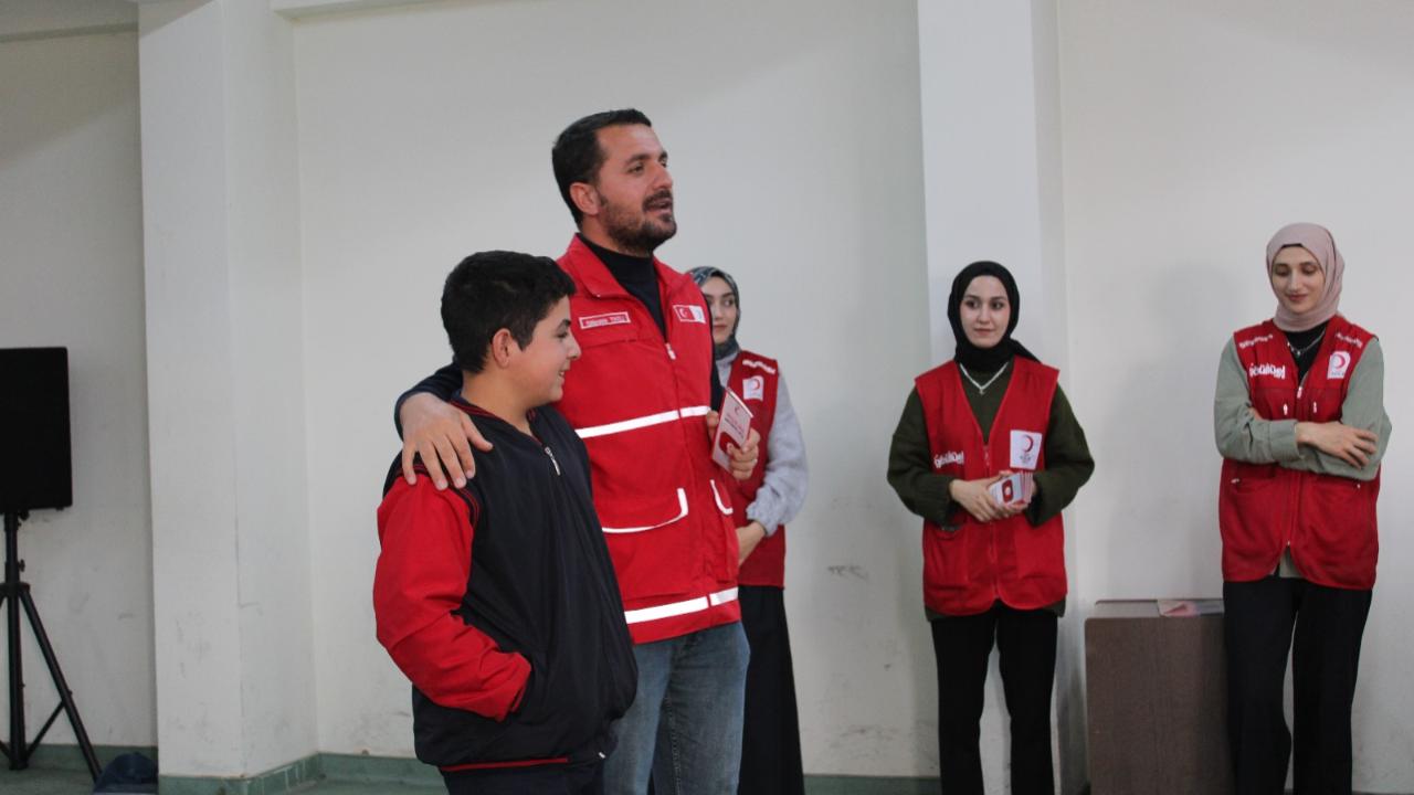 Kızılay gönüllüleriyle birlikte gerçekleştirilen etkinlikte öğrenciler, afetlere karşı bilinçlenmenin önemine vurgu yaparak, verilen bilgileri dikkatle takip etti.