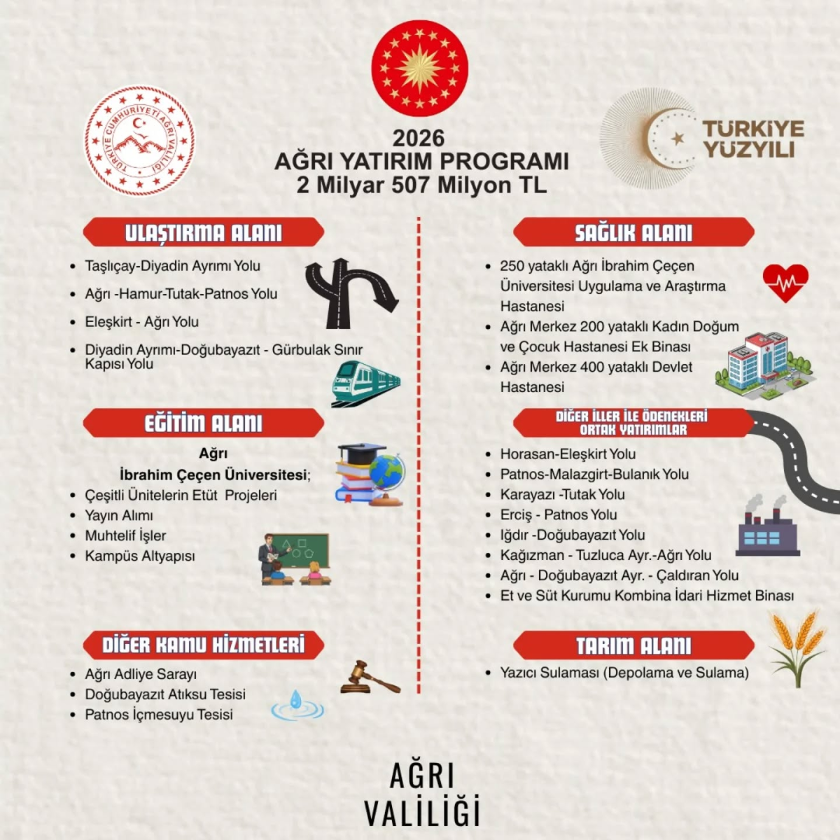 Ağrı Valiliği tarafından açıklanan 2026 yılı yatırım programı kapsamında, il genelinde toplam 2 milyar 507 milyon TL tutarında önemli kamu yatırımları gerçekleştirilecek.
