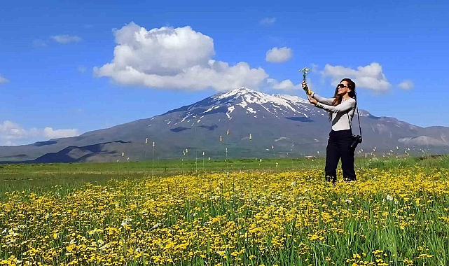 Bahar çiçekleriyle renklenen Sütey Yaylası ve Süphan Dağı hayranlık uyandırıyor