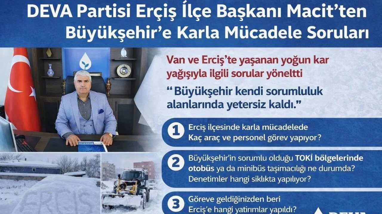 DEVA Partisi Erciş İlçe Başkanı Şahin İsmail Macit, açıklamasının sonunda Van Valisi ve Van Büyükşehir Belediyesi yetkililerine basın aracılığıyla kamuoyu adına sorular yönelterek, karla mücadele çalışmalarındaki aksaklıkların nedenlerinin açıklanmasını ve sorumluluk alanlarında daha etkin bir çalışma yürütülmesini istedi.