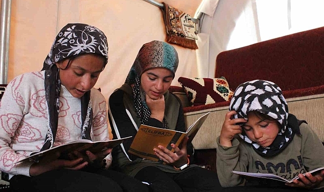 Erzurum'un ortalama 2 bin 600 rakımdaki Dumlu Dağları'nda, Dumlu Baba Yaylası'nda göçerlik yapan ailelerin çocukları çadırda Kur'an-ı Kerim öğreniyor, birlikte oyunlar oynuyor.