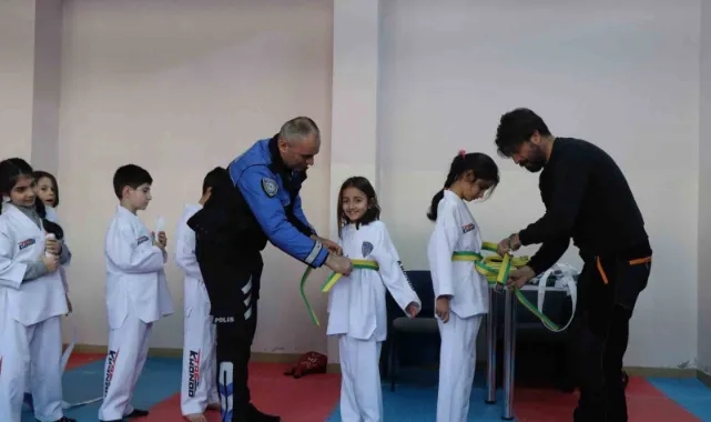 Erzurum'da tekvando kursunu başarı ile bitiren öğrencilerin kuşaklarını polisler bağladı.