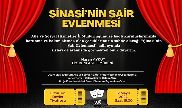 "Şair Evlenmesi" isimli tiyatro gösterisi Erzurum Devlet Tiyatrosunda 12 Mayıs'ta gösterime sunulacak.Aile ve Sosyal Hizmetler İl Müdürü Hasan Aykut konuyla ilgili yaptığı açıklamada şu ifadelere yer verdi: "Erzurum Valiliğimizin himayesinde, Aile ve Sosyal Hizmetler İl Müdürlüğümüz ile Erzurum Devlet Tiyatrosu Bölge Müdürlüğünün iş birliği çerçevesinde, korunma ve bakım altındaki çocuklarımızın sanatsal yeteneklerini keşfetmeleri ve kişisel gelişimlerine katkı sağlamak amacıyla bu önemli projeye imza atmışlardır. İl Müdürümüz Hasan Aykut ve Erzurum Devlet Tiyatrosu Bölge Müdürü Sezai Yılmaz'ın girişimleriyle hayata geçirilen bu proje, çocuklarımızın sanata yönelimlerini sağlama, öz güvenlerini artırma ve topluma katılımlarını güçlendirme amacı gütmektedir. Projemiz kapsamında, tiyatro eğitimi alan korunma ve bakım altındaki 18 çocuğumuz, Özlem Sak ve Özlem Aksu'nun yönetmenliğinde, Sezai Yılmaz ve Ergenekon Cem'in proje koordinatörlüğünde sahne alacaklardır. Çocuklarımızın sergileyeceği "Şair Evlenmesi" adlı tiyatro oyunu, 12 Mayıs 2024 Pazar günü saat 15:00'te Erzurum Devlet Tiyatrosu'nda tiyatro severlerle buluşacaktır."