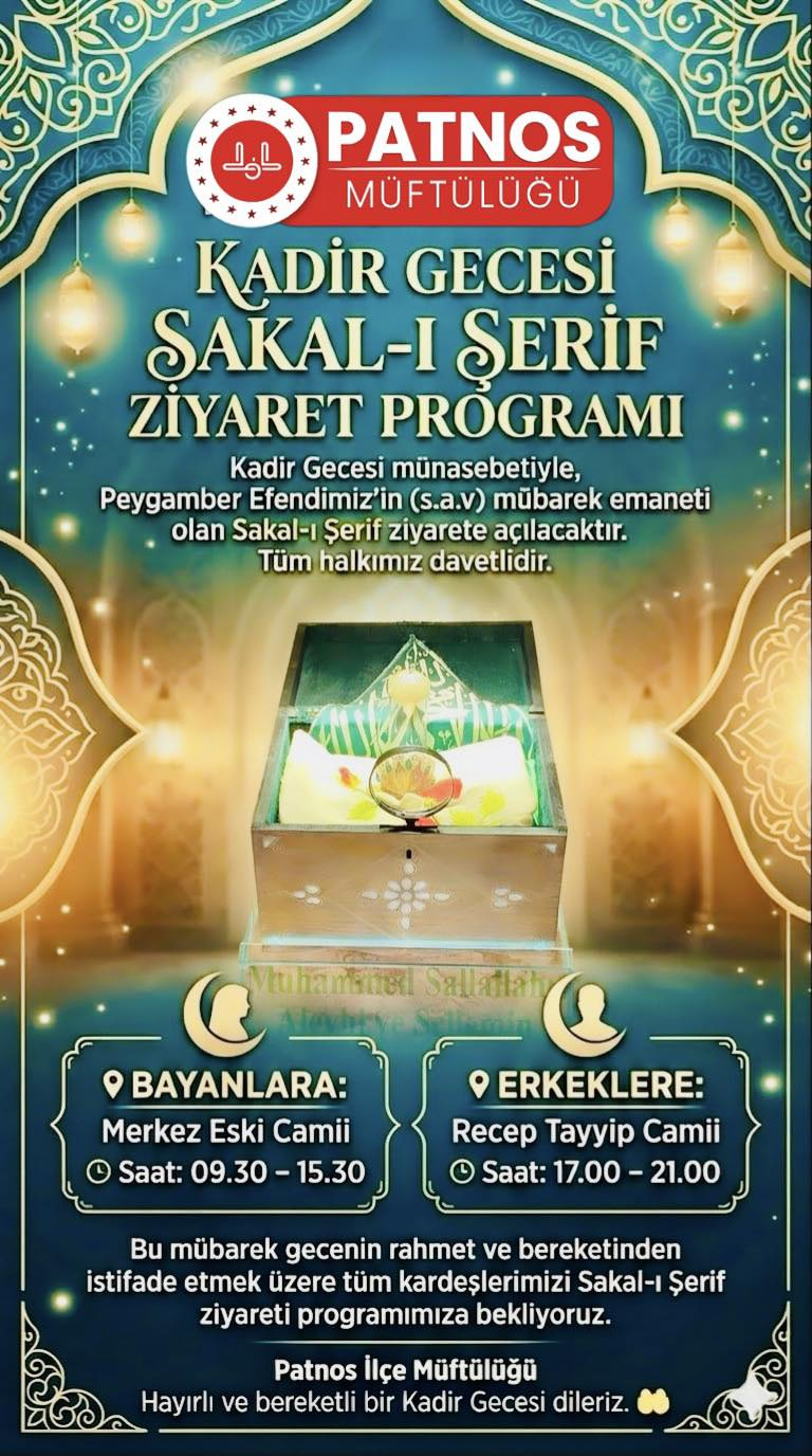 Patnos İlçe Müftülüğü’nden yapılan açıklamada, “Bu mübarek gecenin rahmet ve bereketinden istifade etmek üzere tüm kardeşlerimizi Sakal-ı Şerif ziyaret programımıza bekliyoruz” ifadelerine yer verildi.