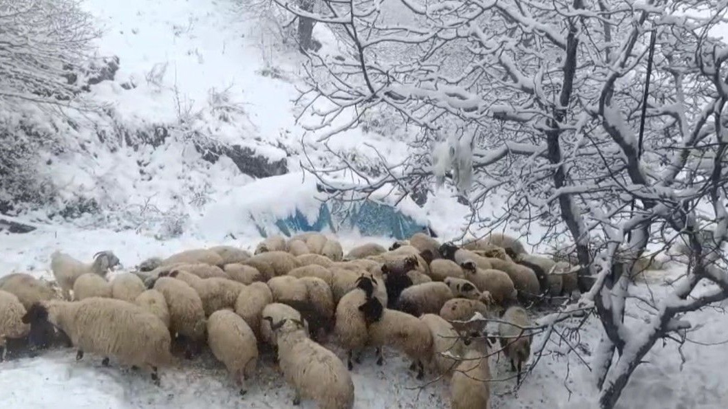 Van’ın Bahçesaray ilçesinde etkili olan kar yağışı hayatı olumsuz etkilerken, mahalle sakinleri hayvanlarını kar üzerinde besliyor.